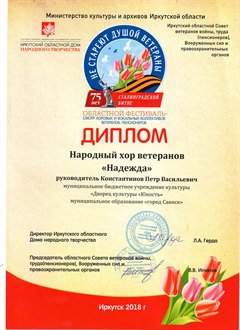 Коллектив хора «Надежда» − самый многочисленный участник программы (37 участников), исполнил песню «Самовары-самопалы» и вокальную композицию «Старое танго». Зал тепло приветствовал участников известных в области коллективов и отметил выступление хора «Надежда» из Саянска бурными аплодисментами. Трехчасовой концертный проект завершился общим исполнением песни «Поклонимся великим тем годам» под звуки духового оркестра.