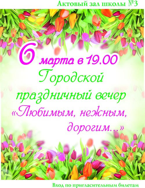 Любимых, нежных, дорогих представительниц прекрасного пола ждут на праздничную программу 6 марта в актовом зале школы №3 по адресу: микрорайон Юбилейный, д. 46 в 19 час. (вход по пригласительным билетам)