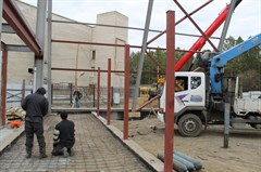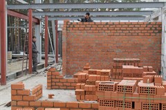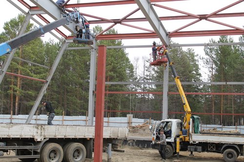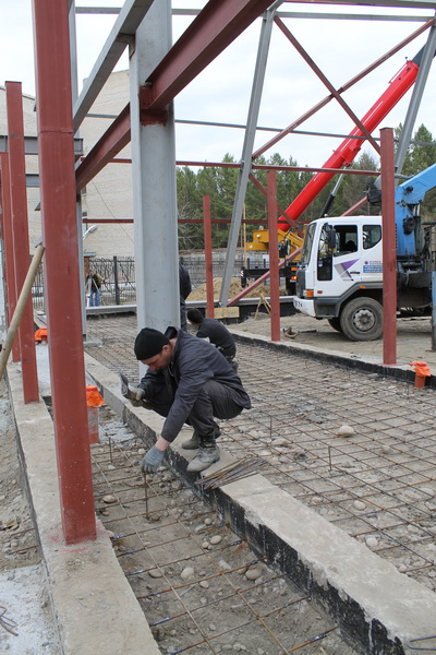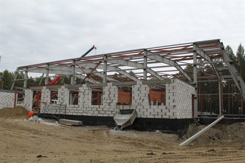 Идет работа на строительстве физкультурно-оздоровительного комплекса. Как рассказал прораб ООО «Новострой» Максим Константинов, каркас основного здания готов практически на 100%, выполнены фундаменты и стены пристроенной части (в ней будут располагаться кабинеты, тренерские, раздевалки, душевые). В пристроенной части идет кладка внутренних стен, перегородок, армирование, затем бетонирование полов. Канализация выполнена полностью. Параллельно проводится отсыпка территории грунтом под благоустройство. Ожидается поступление сэндвич-панелей – для монтажа кровли, а затем стен.