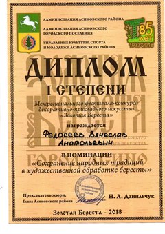 Классик берестяного ремесла, народный мастер Вячеслав Федосеев, покорил строгое жюри, жителей и гостей города Асино своими работами. Саянский берестянщик принял участие в V межрегиональном фестивале-конкурсе декоративно-прикладного искусства «Золотая береста» в Асиновском районе и стал победителем в номинации «Сохранение народных традиций в художественной обработке бересты». В конкурсе участвовали мастера из Иркутской, Томской и Кемеровской областей. Каждый мастер стремился удивить.