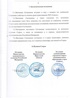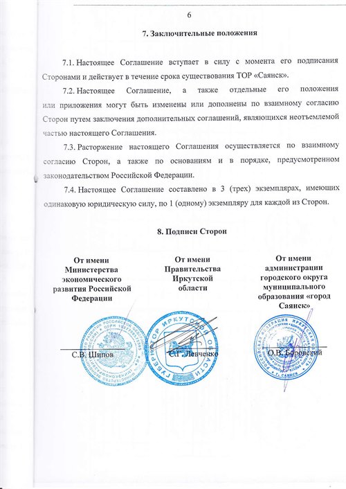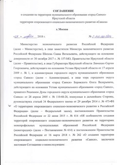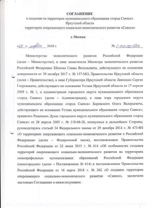 Подписано соглашение о создании в городе Саянске территории опережающего социально-экономического развития. Под документом стоят три подписи. От имени министерства экономического развития Российской Федерации документ подписал заместитель министра Савва Шипов, от имени Правительства Иркутской области – губернатор Сергей Левченко, от имени администрации города Саянска – мэр Олег Боровский. Статус ТОСЭР был присвоен городу в марте текущего года.