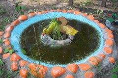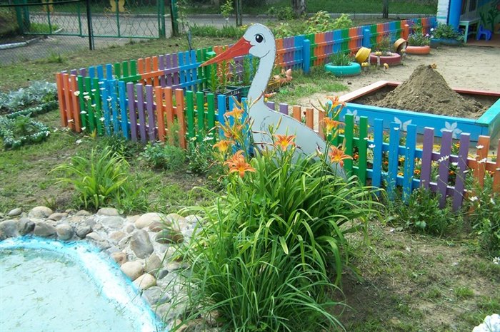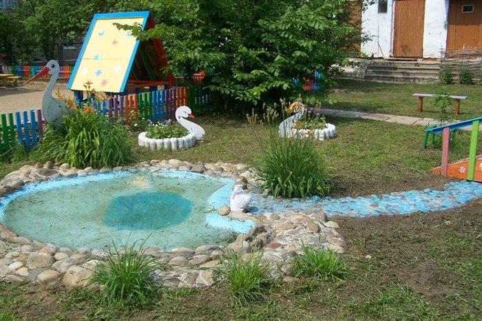 Еще в «Васильке» полянка для отдыха. Это настоящий оазис красоты! Весной ее называют «золотой луг», поскольку весь участок покрывается ковром из одуванчиков. Педагоги и родители создали эту красоту − искусственный водоем, лебеди, цапля, скамейки для отдыха. Здесь любят отдохнуть не только дети, но и родители малышей.