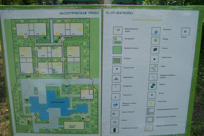 Птичий дворик, огород, фитополянка с настоящими грибами, экологическая тропа – педагоги стараются привить детям любовь к природе и животным. В детском саду есть проект «Деревья нашего двора». Ребята знакомятся с видами деревьев, которых на территории детского сада большое разнообразие. Есть даже настоящий дуб. Его вырастили их крохотного желудя. Несмотря на сибирский климат, дерево прижилось и растет не хуже других. В летний период педагоги сада проводят занятия на экологической тропе. Как на ней ориентироваться – подсказывает специальная карта. Условными обозначениями здесь отмечены кустарники, деревья, растения.