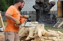− Это огромное удовольствие, − говорит Валерий. – Резьбой занимаюсь очень давно, вырезаю картины. Пилением скульптур можно заниматься только летом. Дерево – мой любимый материал. Для меня дерево – это воспоминания о детстве, которое прошло рядом с лесом, горами.