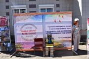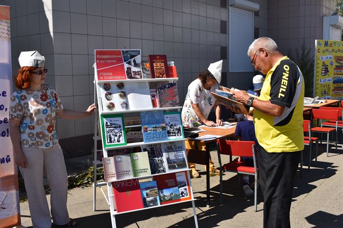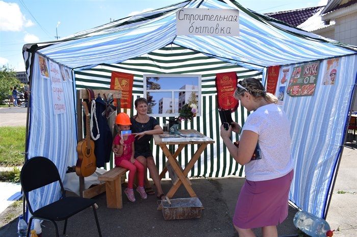 Внимание горожан привлекли стенды с фотографиями по истории строительства города. В тематической экспозиции саянцы могли погрузиться в 70-е годы. Желающие могли сфотографироваться в строительной бытовке. Вымпелы на стенах красноречиво говорят о достижениях тех, чья, спецодежда и гитара, рядом, на столе − строительная каска, журналы «Огонек». Библиотекари предлагали детям и взрослым настольные игры, стенды с книгами, также они мастерили пилотки из старых газет, за которыми выстроилась очередь. Художники раскрасили лица малышей веселыми картинками.