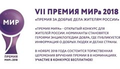 В ноябре 2018 года Общероссийская молодежная общественная организация «МИР» организует восьмую ежегодную торжественную церемонию вручения Премии МИРа жителям России за добрые дела.