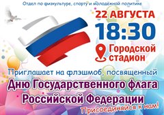 В рамках празднования Дня Государственного флага Российской Федерации, который отмечается 22 августа, отдел по физкультуре, спорту и молодежной политике приглашает молодёжь г. Саянска принять участие во флешмобе "Под флагом единым"!