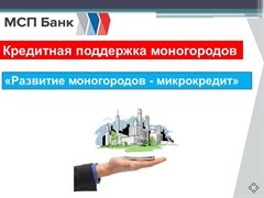 АО «МСП Банк» разработал новый специальный кредитный продукт «Развитие моногородов – микрокредит» для начинающих индивидуальных предпринимателей, зарегистрированных или осуществляющих деятельность на территории монопрофильных муниципальных образований, который предполагает предоставление кредитования в максимально сжатые сроки на основании минимального комплекта документов.