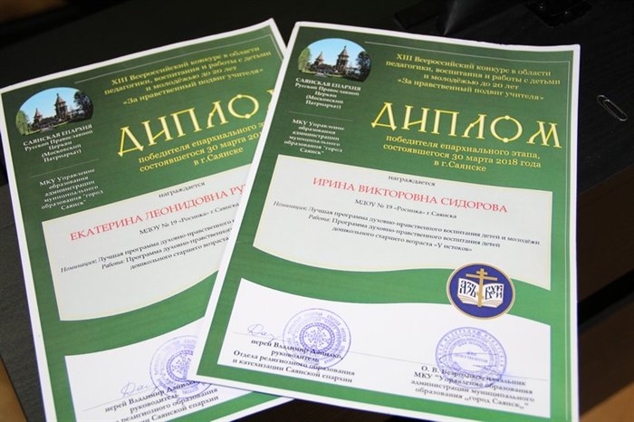 Дипломами победителей епархиального этапа отмечена работа саянского детского сада №19. Программу духовно-нравственного воспитания детей старшего дошкольного возраста «У истоков» на церемонии закрытия II межрегионального этапа XIII Всероссийского конкурса "За нравственный подвиг учителя" представили музыкальные руководители дошкольного учреждения – Екатерина Рукосуева и Ирина Сидорова.