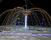 Зимний вариант фонтана украшает городскую площадку уже несколько лет. В прошлом году несколько изношенную конструкцию «Мегаполис-спорт» отреставрировал. На средства учреждения были полностью заменены светодиоды подсветки и гирлянды. За прошедший сезон конструкция сохранилась в надлежащем виде, работниками «Мегаполис-спорта» и «Водоканала» она была установлена.
