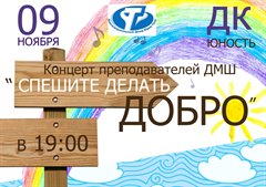 Концертная программа «Спешите делать добро» начнется в 19 часов 9 ноября, обещает быть интересной, поэтому мы приглашаем в ДК «Юность» всех, кто любит красивую музыку, чьи сердца открыты добру и радости!