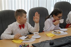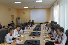 Сегодня в зале заседаний городской администрации мэр Саянска Олег Боровский принимал за чашкой чая городскую команду КВН «Камикадзе» с их руководителем Мариной Вологдиной и помощником Виктором Воронковым. В этом составе саянские КВНщики заняли второе место на открытом Московском фестивале детских команд КВН.