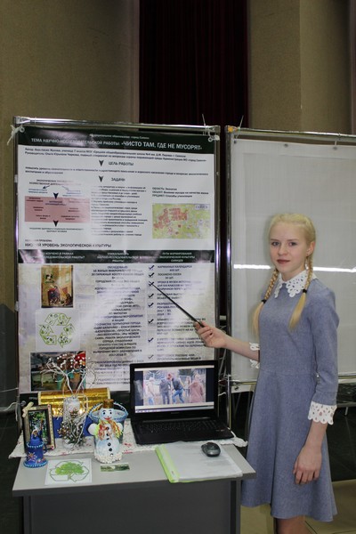 Саянск представляла ученица 7 класса школы №4 Анастасия Жукова. Она работала в секции «Социальная экология», где представила свой проект «Чисто там, где не сорят». Основная цель работы заключается в повышении уровня экологической культуры и формировании экологического воспитания подрастающего поколения. На протяжении двух лет Анастасия совместно со своим руководителем Ольгой Чирковой, главным специалистом по вопросам охраны окружающей среды, изучала проблемы замусоривания территорий города, анализировала отношение жителей к этой проблеме и апробировала предложенные пути решения данного вопроса.