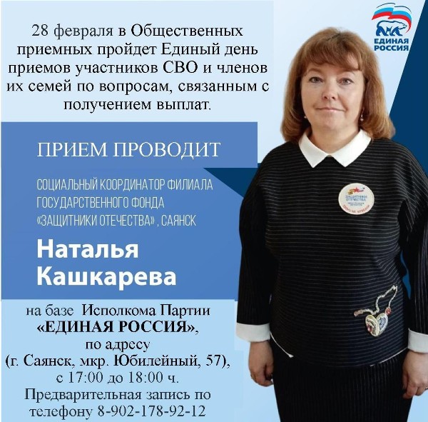 28 февраля 2025г. с 17:00 до 18:00 | г. Саянск, мкр-н Юбилейный, дом 57 (Исполком Партии "Единая Россия")