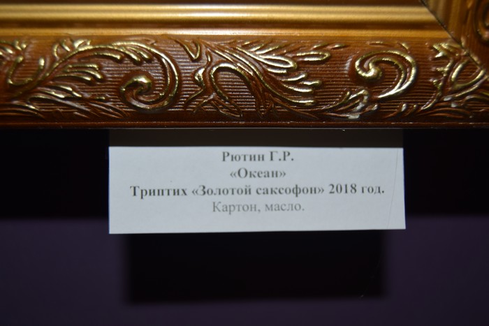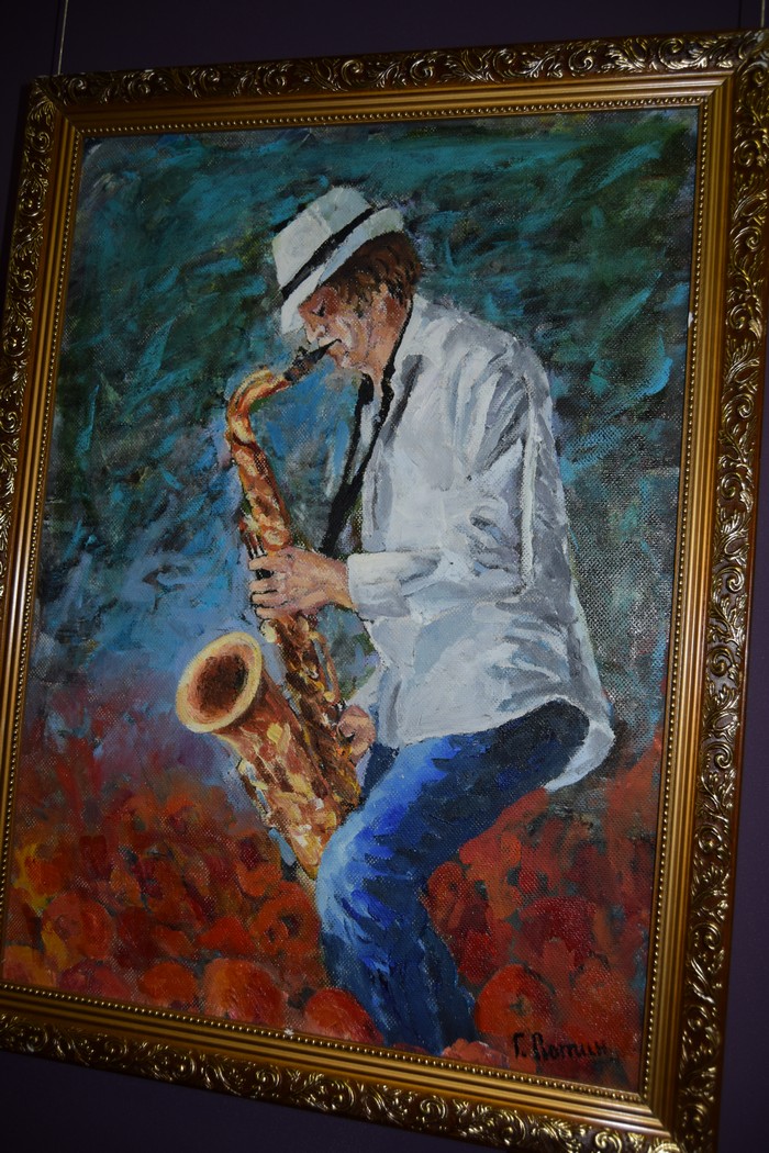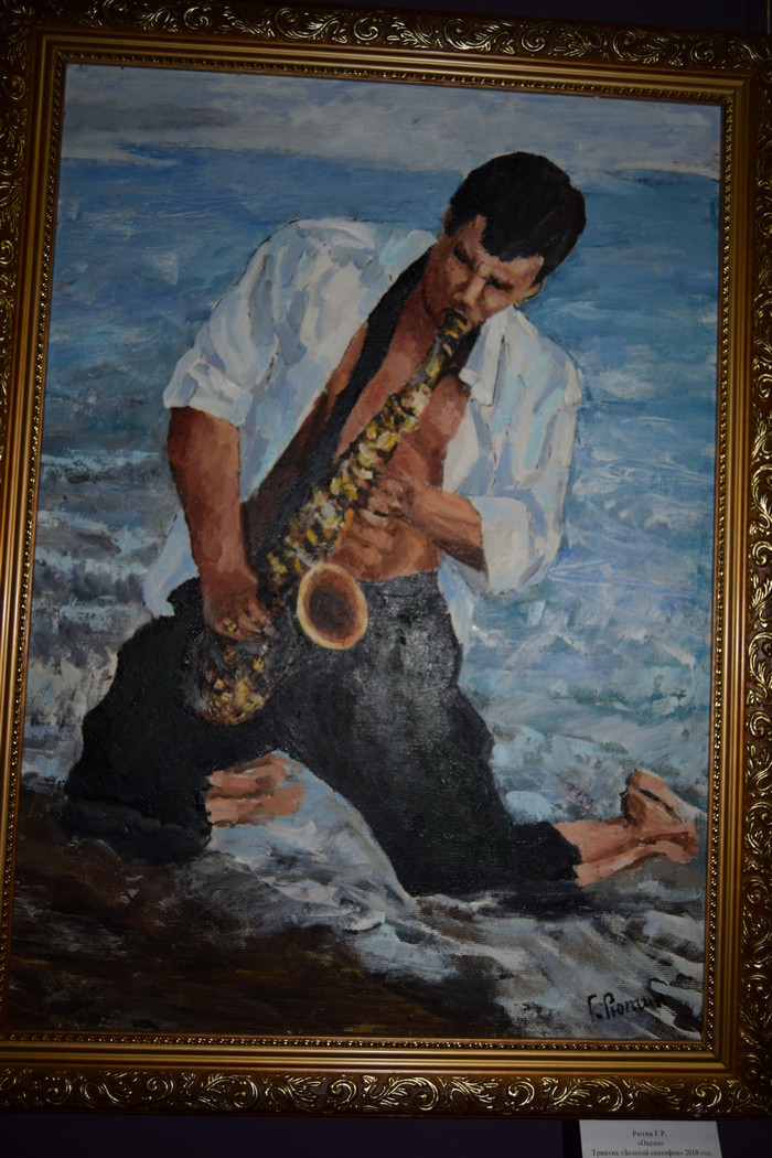 Из новинок на выставке представлен триптих «Золотой саксофон», автопортрет. На картинах с музыкальным инструментом в руках изображены совершенно незнакомые автору люди − в маках, у моря, у воды. Это художественный вымысел художника. Георгий Рютин рассказал, что в музыке и в природе он черпает вдохновение для своего творчества. «Я еще не написал той картины, которой бы был доволен. Все еще впереди», − считает Георгий Романович.