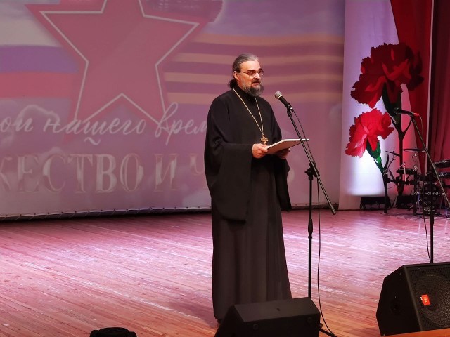 С приветственными словами на сцену вышел секретарь Епархиального управления, иерей Владимир Данилко.