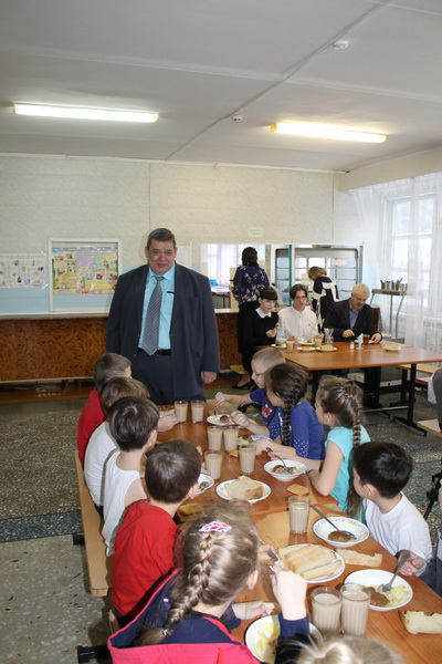 Мэр осмотрел оборудование, беседовал с поварами, общался с ребятами и, конечно, сам попробовал школьную еду. Качеством школьного питания он остался доволен.