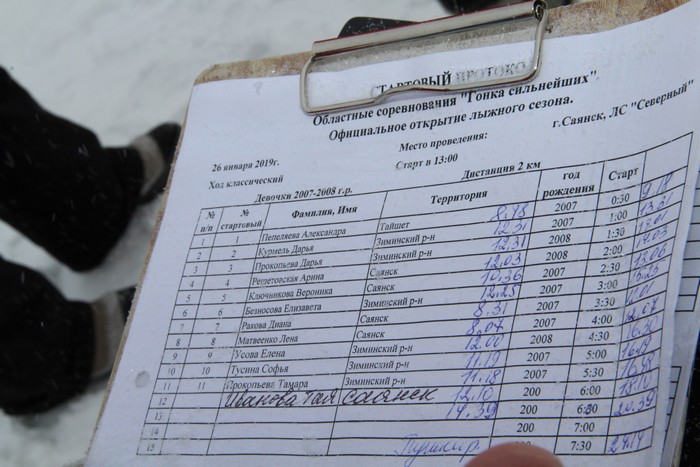 Первыми стартовали самые маленькие девочки 2007-2008 годов рождения. Они бежали дистанцию два километра. В этой группе сильнейшие лыжники Саянска: Елена Матвеенко, двукратная чемпионка области и Диана Ракова – призер областных соревнований. С ними девочки из Заларинского района и Тайшета, тоже призеры областных соревнований. Всего в первой группе стартовали 13 человек.