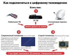Для приема 20 каналов бесплатного цифрового эфирного телевидения достаточно приобрести антенну дециметрового диапазона (коллективную или индивидуальную, наружную или комнатную). Большинство современных телевизоров (выпущенные после 2013 года) поддерживают стандарт вещания DVB-T2, в котором транслируются бесплатные мультиплексы. Если телевизор старого образца, потребуется дополнительно установить специальную цифровую приставку. Приобрести необходимое оборудование можно в магазинах, торгующих электроникой.