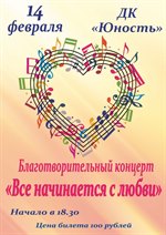 Саянский городской совет женщин совместно с пятым отрядом противопожарной службы и городским отделением Всероссийского добровольного противопожарного общества (ВДПО) при поддержке ДК «Юность» 14 февраля проводят благотворительный концерт «Все начинается с любви», начало в 18:30.