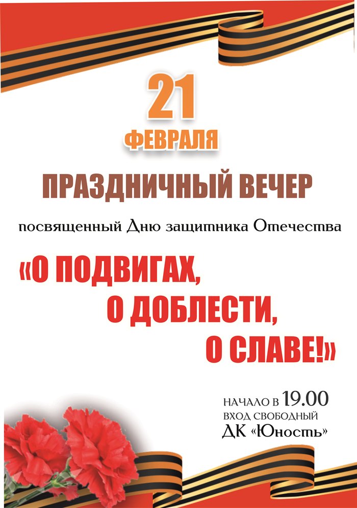 Праздничный вечер, посвященный Дню защитника Отчества состоится во Дворце культы "Юность" 21 февраля в 19 часов. Вход свободный.