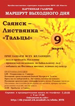 Весело проводить Масленицу на берегу Байкала приглашает Саянская картинная галерея 9 марта. По пути в Листвянку путешественники посетят храм в поселке Тельма, прогуляются по набережной озера Байкал, покатаются на коньках по его льду, побывают в архитекрутно-этнографическом музеи в Тальцах. Путешествие обещает быть интересным.
