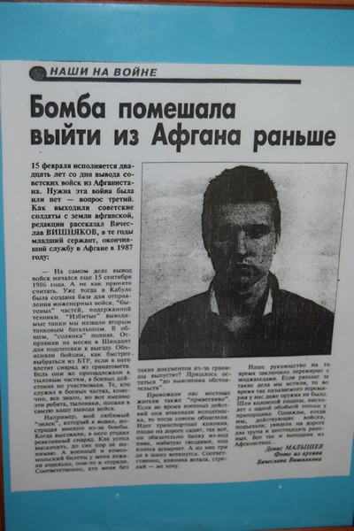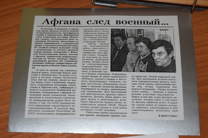 Первыми посетителями выставки об афганской войне стали ребята из детских объединений Дома детского творчества и восьмиклассники пятой школы. Рассказ Ольг Бисеровой тронул ребят до глубины души. Многие молчаливо разглядывали экспонаты, а кто-то рассказывал то, что знает об той войне.