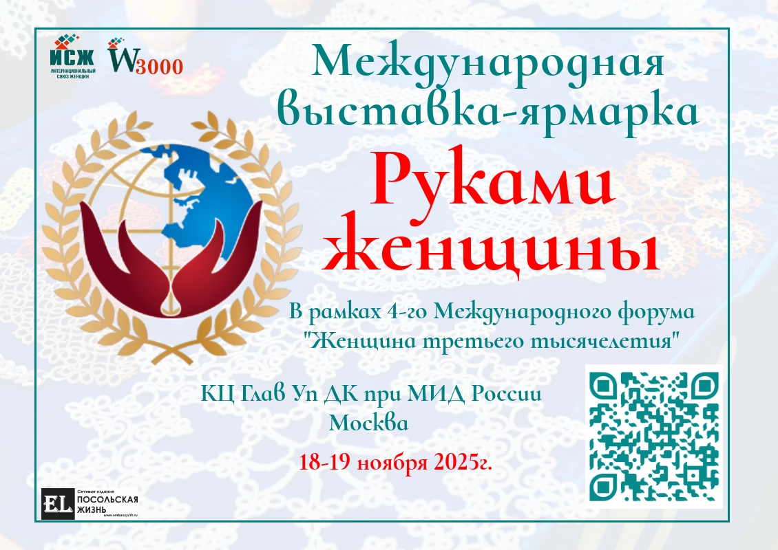 Информируем о проведении Международной выставки-ярмарки «Руками женщины», которая состоится 18-19 ноября 2025 года в Москве на престижной площадке Культурного центра ГлавУПДК при МИД России в рамках IV Международного форума «Женщина третьего тысячелетия».