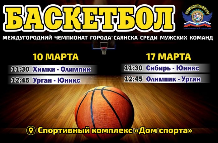 Междугородний чемпионат по баскетболу среди мужских команд пройдет 10 и 17 марта в Доме спорта. Начало игр в 11:30.