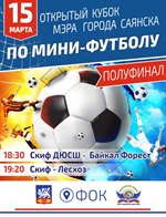 Открытый кубок мэра города Саянска по мини-футболу состоится в физкультурно-оздоровительном комплексе 15 марта. Начало игр в 18:30. Пройдут две игры. Скиф-ДЮСШ сразится с зиминским БайкалФорестом, а команда Скиф с зиминским Лесхозом. Начало второй игры в 19.20