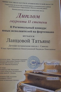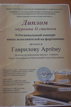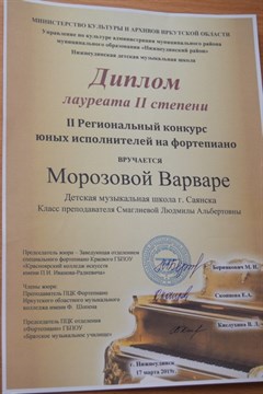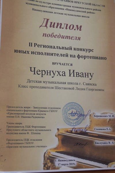 Одним из главных критериев их оценки являлось музыкальное чувство исполнителя. В творческом состязании приняли участие 35 учеников детских школ искусств Иркутской области. Наш город представляли одиннадцать юных дарований детской музыкальной школы. Ребята выступали в разных возрастных категориях. По оценке членов жюри и педагогов детской музыкальной школы Саянска, наши музыканты показали себя на достойном уровне. В репертуаре саянских конкурсантов были сложные полифоничные произведения композиторов с мировым именем − Баха, Бетховена, Ланге и других. Итоги участия саянцев впечатляют. Трое юных исполнителей на фортепиано стали лауреатами II степени − это Татьяна Ланцова, Артем Гаврилов, Варвара Морозова. Дипломантом II Регионального конкурса юных пианистов стал наш Иван Чернуха. Все победители конкурса были награждены дипломами и памятными статуэтками.