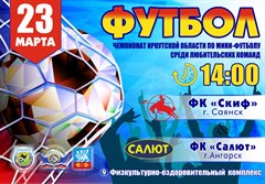 Чемпионат Иркутской области по мини-футболу среди любительских команд пройдет 23 марта в физкультурно-оздоровительном комплексе. Играют саянский "Скиф" и ангарский "Салют". Начало матча в 14:00.