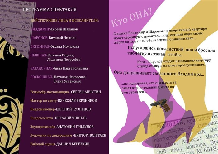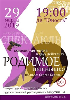 Комедию-детектив в двух действиях ставит на сцене ДК "Юность" саянский театр-студия "Внутри" (художественный руководитель Сергей Анчутин). Начало спектакля 29 марта в 19 часов.