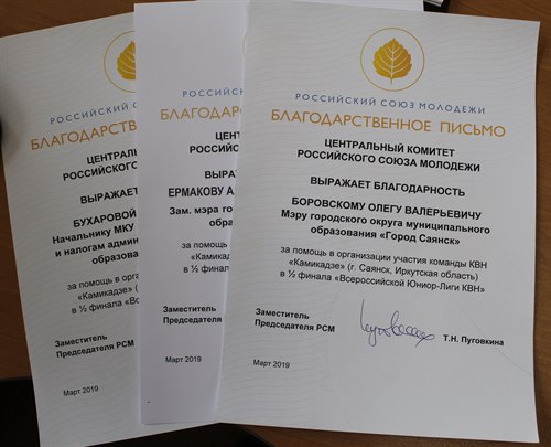 Благодарственные письма центрального комитета Российского союза молодежи за помощь в организации участия команды КВН «Камикадзе» в полуфинале «Всероссийской Юниор-Лиги КВН», прошедшем в марте, направлены в адрес мэра Саянска Олега Боровского, заместителя мэра по социальным вопросам Александра Ермакова, начальника управления по финансам и налогам администрации Ирины Бухаровой.