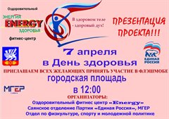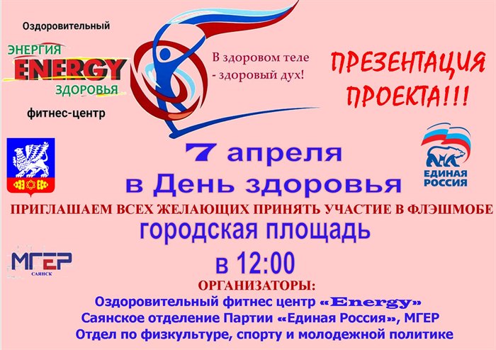 Отдел по физической культуре, спорту и молодежной политике совместно с Саянским отделением партии "Единая Россия" и оздоровительным центром "Energy" 7 апреля, в День здоровья приглашают всех желающих на городскую площадь для участия во флэшмобе. Мероприятие пройдет в рамках проекта " В здоровом теле – здоровый дух!". Начало мероприятия в 12:00.