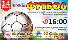 Чемпионат Иркутской области по мини-футболу среди любительских команд пройдет в физкультурно-оздоровительном центре Саянска 14 апреля. Встречаются саянская команда "Скиф" и иркутские футболисты из команды "ИрАэро". Начало игры в 16 часов.