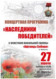 Иркутская областная общественная организация ветеранов Афганистана проводит цикл патриотических мероприятий – музыкальных диалогов с молодежью «Наследники Победителей». Город Саянск включен в график выступлений вокальной группы ветеранов Афганистана и участников боевых действий «Афганцы Сибири».