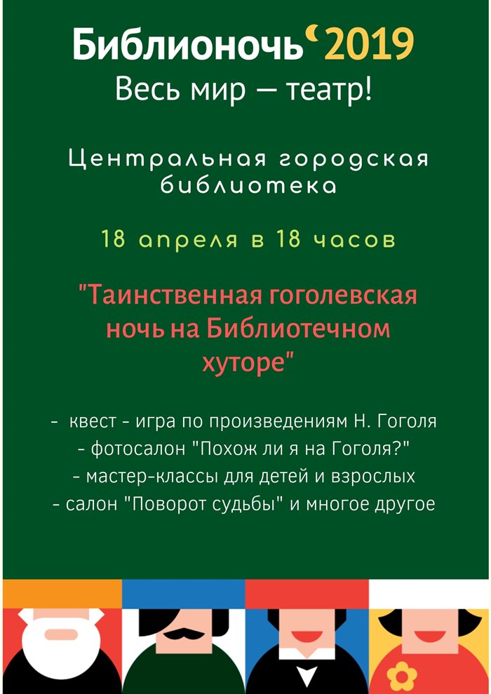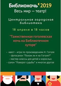 Весь мир – театр. 18 апреля в 18:00 Центральная городская библиотека проводит Библионочь-2019. В программе мероприятия: квест-игра по произведениям Гоголя, фотосалон "Похож ли я на Гоголя?", мастер-классы для детей и взрослых, салон "Поворот судьбы" и много другого интересного.