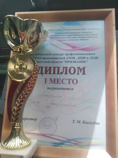 Ольга Анчутина, заместитель директора детской художественной школы города Саянска, заняла первое место в первом региональном конкурсе профессионального мастерства преподавателей детских школ искусств «Призвание», который проводил областной учебно-методический центр культуры и искусства «Байкал». Конкурс прошел в два этапа. Первый – заочный, на который участники представили свое портфолио, указав этапы творческой биографии, программы, по которым работают, опыт и результаты педагогической деятельности, достижения своих учеников. По итогам этого этапа было отобрано тринадцать конкурсантов. Второй этап был разбит на два тура. В первом участники представили видеозапись своих мастер-классов на свободную тему, во втором, прошедшем 20 апреля в Иркутской областной школе искусств, показали себя в конкурсе визиток (самопрезентаций). В группу поддержки на конкурсе самопрезентаций вошли заместитель начальника управления культуры Ирина Корелина, коллеги Ольги Анчутиной по художественной школе.