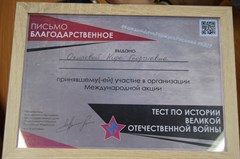 Знать историю своей страны необходимо – в этом уверены все, кто сегодня написал тест. Тест включал в себя тридцать вопросов и четыре варианта ответа на каждый. Участникам акции нужно было выбрать только один правильный ответ. Вопросы были о героях, партизанах, крупных и решающих сражениях, основных вехах войны. Больше всех правильных ответов по тесту дал председатель молодежного парламента Саянска Александр Быков. Он признался, что тест был довольно непростым. В будущем году молодые парламентарии намерены провести акцию в более широком масштабе.
