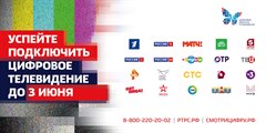3 июня 2019 года на территории Иркутской области будет осуществлен переход на цифровое телевизионное вещание. Аналоговое вещание телеканалов будет прекращено.