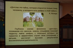 – Мир детства – это особый мир, имеющий свои закономерности и свое пространство, − отметила Виктория Анатольевна, − Что нужно, чтобы дети, став взрослыми, находили подсказки для решения жизненных ситуаций и проблем? – в этом наша задача. В поисках ответов она обратилась к классикам педагоги и психологии.