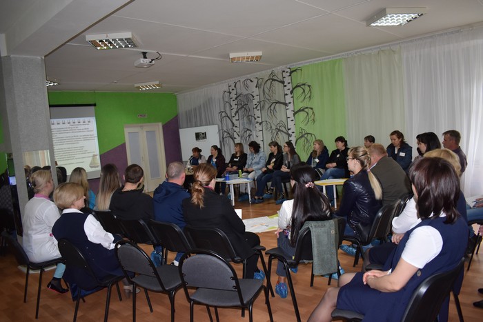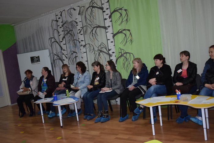 Нынешнее занятие, как и все предыдущие, было тщательно спланировано педагогами: сразу после регистрации мамы и папы получали кораблики, по цветам которых ориентировались, за каким столиком занимать места. На столах разложены памятки – родители с интересом читали советы педагогов: как развивать самостоятельность, как научить ребенка пользоваться ложкой, мыть руки и прочее, знакомились с примерным меню на каждый день.