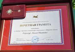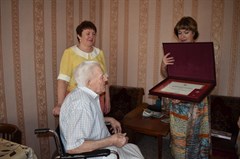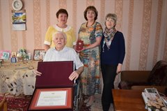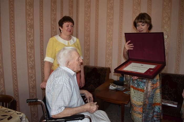 Почетную грамоту Законодательного собрания Иркутской области саянцу, участнику Великой Отечественной войны Леониду Матвеевичу Охремчуку вручила депутат Заксобрания Ольга Безродных.