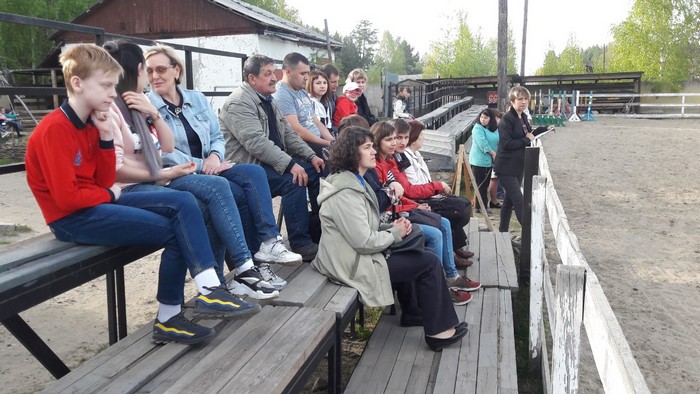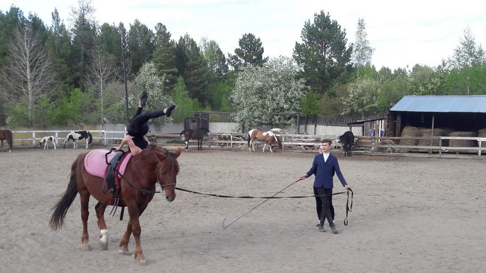 Сегодня в конных состязаниях приняли участие тринадцать юных спортсменов. Начались испытания для наездников с показательного номера самых опытных вольтижеров. Номер был поставлен ребятами и тренером по вольтижировке Мариной Толстобровой.