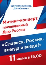 Митинг-концерт, посвященный Дню России "Славься, Россия, всегда и везде!" состоится на площадке у центрального входа в ДК "Юность" 11 июня в 15 часов.