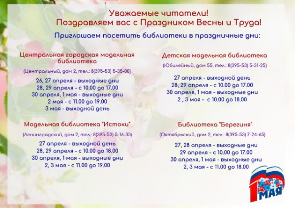 Коллектив Централизованной библиотечной системы поздравляет с праздником Весны и Труда и ждёт своих читателей