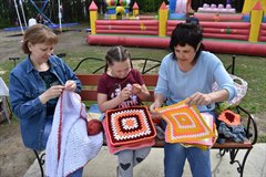Сегодня − всемирный день вязания. Саянские рукодельницы решили отметить эту дату благотворительной акцией. В интернете распространили призыв вязать квадраты определенного размера для пледов, которые будут переданы детям в Саянский дом-интернат. Откликнулись порядка 30 человек. Вечером женщины собрались у фонтана и соединили квадраты в пледы. Кто-то не смог прийти, передал вязаные элементы. Акция привлекла внимание людей. Девчонки, проходившие мимо, тут же решили научиться вязать. Рукодельницы вручили им пряжу и крючки, показали мастер-класс.