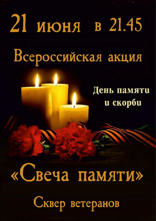 В рамках проведения мероприятий, посвященных Дню памяти и скорби, 21 июня в 21.45 у Стены Памяти в сквере Ветеранов будет проводиться акция «Свеча памяти». В рамках акции будут возложены цветы, зажжены свечи памяти, проведена лития священнослужителями Благовещенского храма.