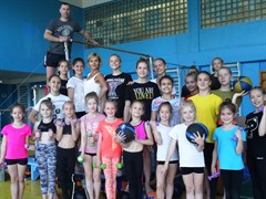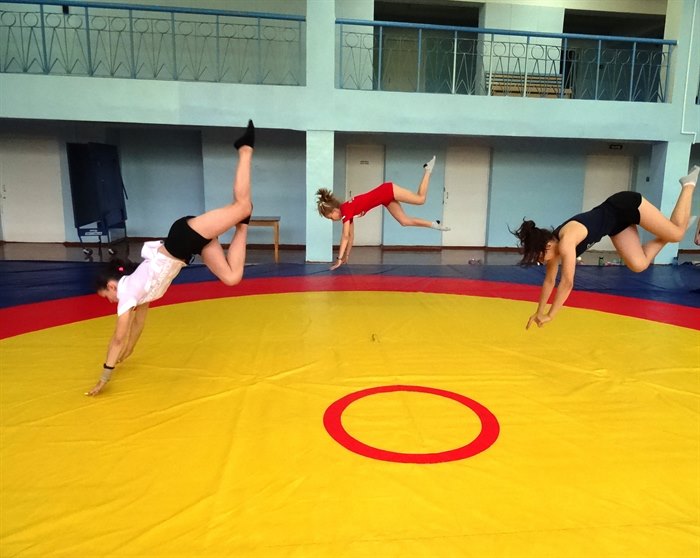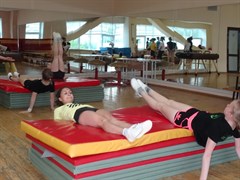 Занимались девушки спортивной гимнастикой, прыжковой акробатикой, которая нужна сейчас в спортивной аэробике. Девочки осваивали новые элементы, вновь открытые в дисциплине, это делласалы, сальто и подводящие упражнения к сложным элементам.